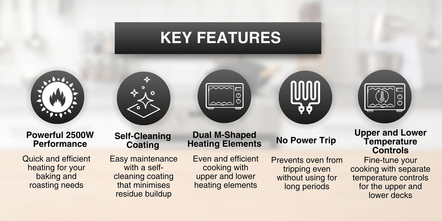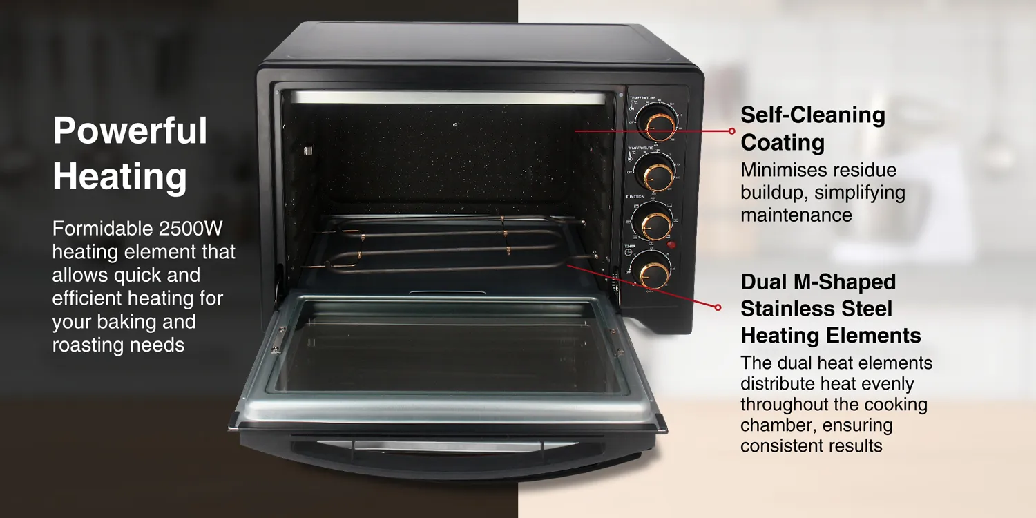 When it comes to cooking, power matters. Our oven boasts a formidable 2500W heating element, ensuring that you can achieve quick and efficient heating for all your cooking needs. Whether you’re searing, roasting, baking, or grilling, this powerhouse is up to the task.