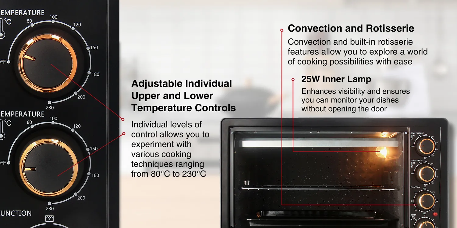Keep a close eye on your culinary masterpieces with the 25W inner lamp. This enhanced visibility, ensures that you can monitor your dishes without opening the door, preserving the ideal cooking environment, and allowing you to perfect your cooking techniques.