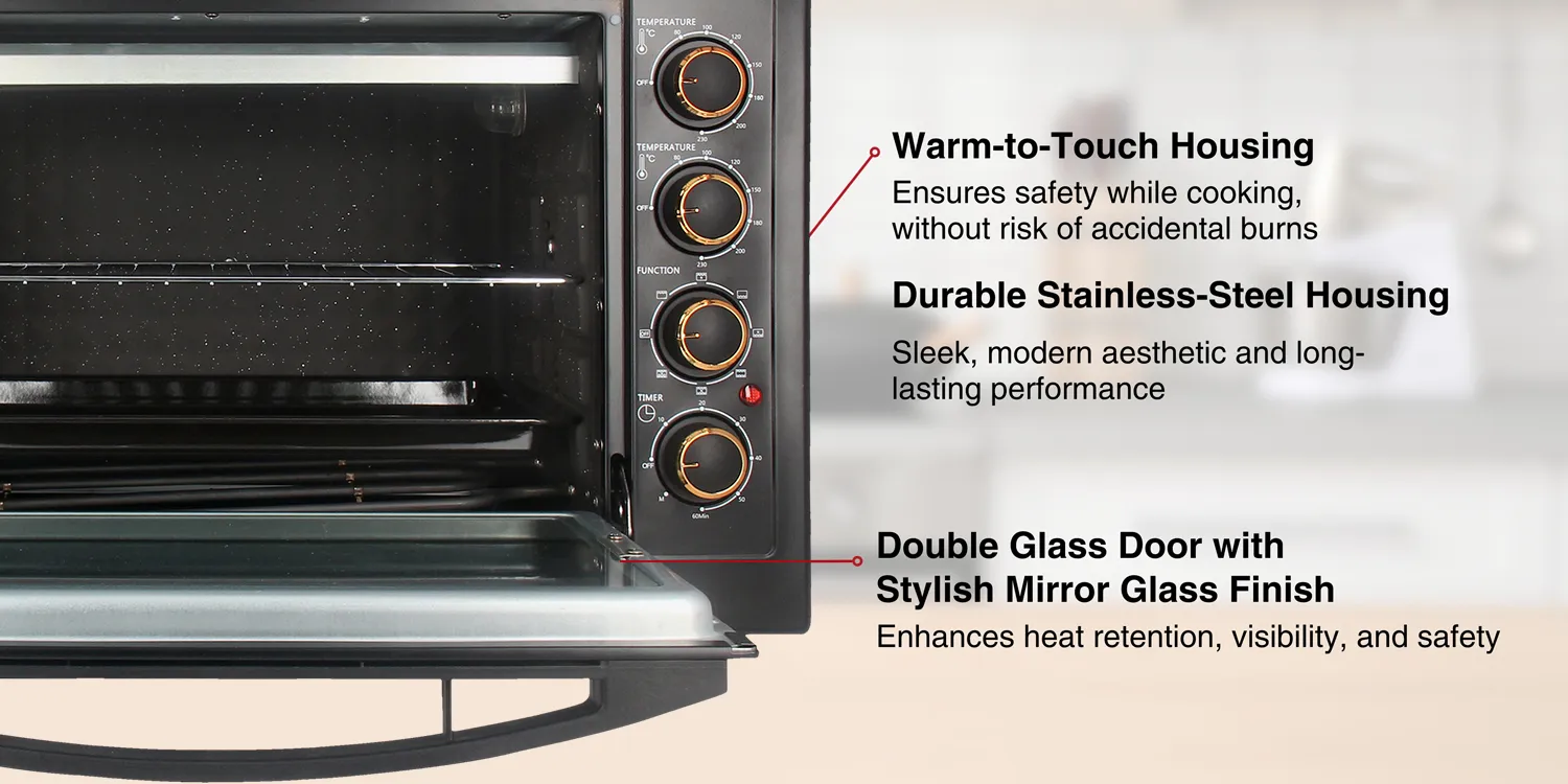 Enhance heat retention, visibility and safety with the double glass door, featuring a stylish mirror glass finish. Watch your dishes come to life as they cook, all while maintaining the ideal cooking environment for consistent, flavourful results.